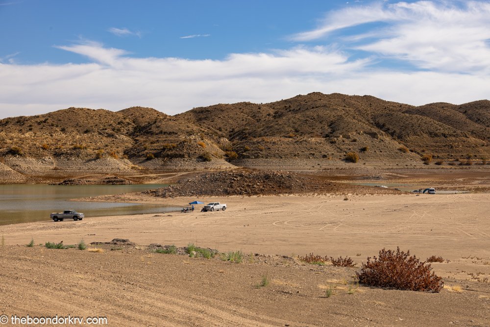 I don't recall ever seeing the water this low at Elephant Butte State Park. The water is so low that it changes the whole look of the place. What used to be islands in the middle of the lake have become just more beach area that you can drive on. And areas where the water used to come up near the tree line, where I normally camp, the water is now a 10-minute walk from what used to be the shoreline.