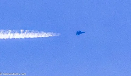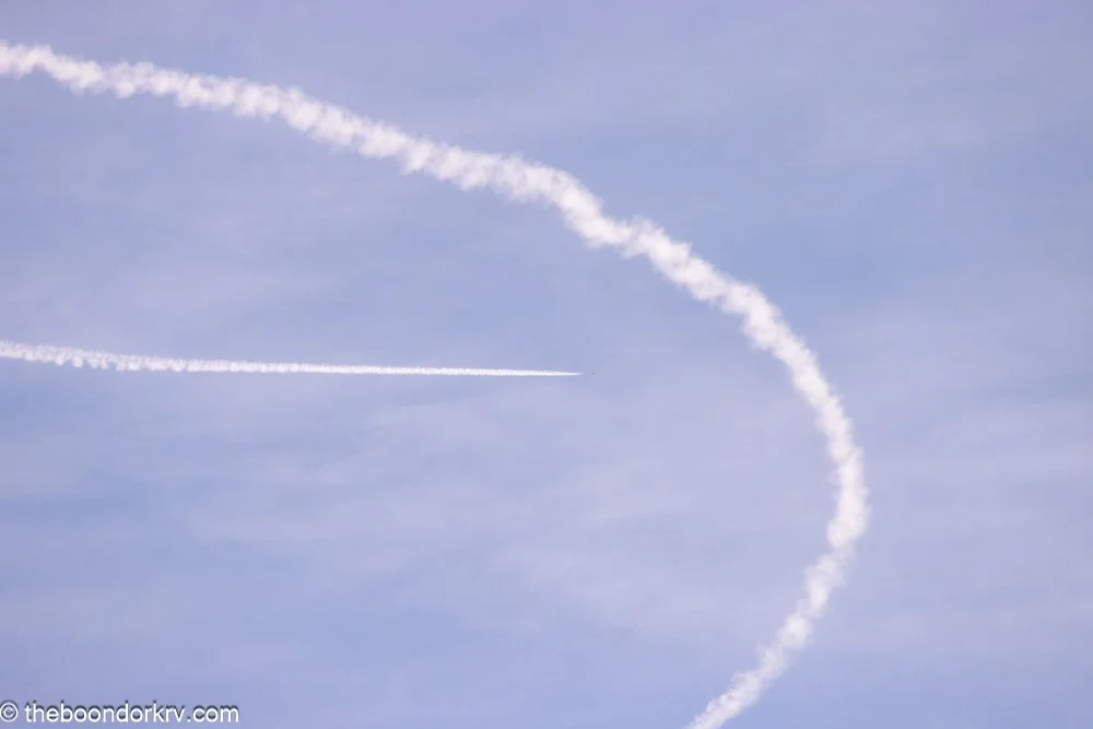 These are the contrails I see in the sky made by the military jets over the bombing range. Notice there are no airplanes visible; the contrails are the only clue that there's a plane up there. To get a picture of an airplane, I look at the newest part of the contrail, which is the smallest end, and take a picture of that part of the contrail. With any luck, there will be a plane out ahead of the Contrail.
