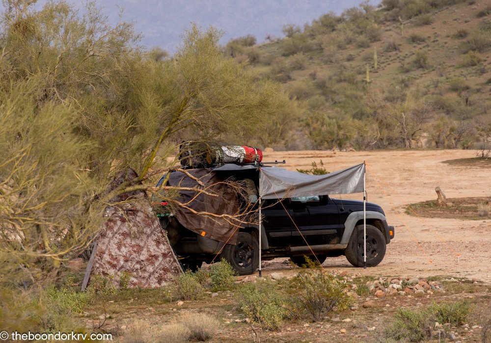 One of my boondocking neighbors. He pulled in yesterday afternoon, and it must have taken him an hour to set all this up. And then by morning, he was gone. Seems like a lot of trouble for an overnight stay.