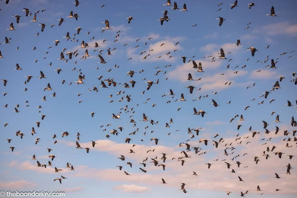 There are a lot of Sandhill cranes here, I don't know how many. But rangers in the past have told me that they've had as many as 20,000 cranes here at one time. I don't know if there are that many here now, but there are at least as many as I've ever seen before, and yet there's only about half the amount of water in the lakes that I've seen in the past.