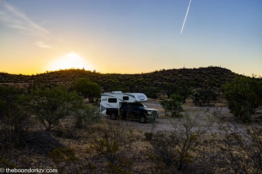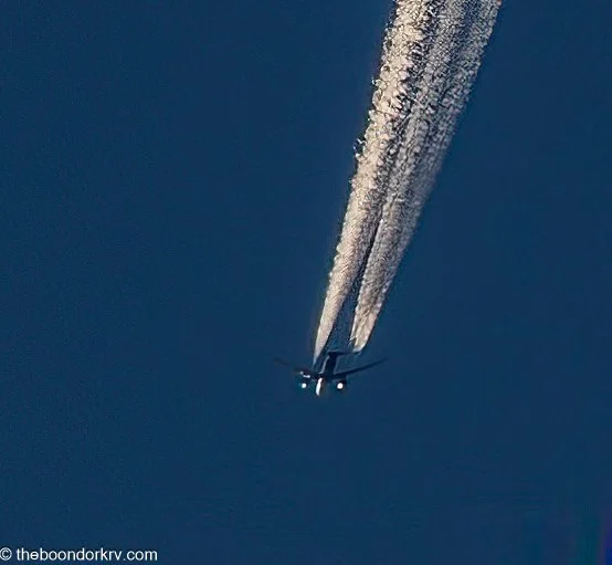 See the contrail in the sky, just above and to the right of my camper? That contrail should be about 36,000 feet high, and who knows how far away. But hidden on the lower end of it is a commercial jet passenger plane.....