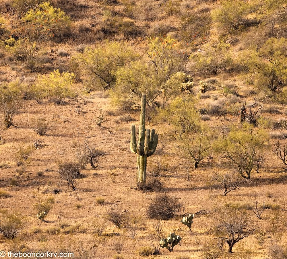This is a telephoto picture that I took of the perfect saguaro in the middle of the picture. After I took the picture, I could see that there were Ocotillos behind the Saguaro with red blooms on them. Ordinarily, I would walk over there and take pictures of the Ocotillo flowers, but because of the remote possibility of rattlesnakes, I decided not to; I figured that bravery could get me into more trouble than stupidity. And my stupidity is easier for my friends and family to understand.