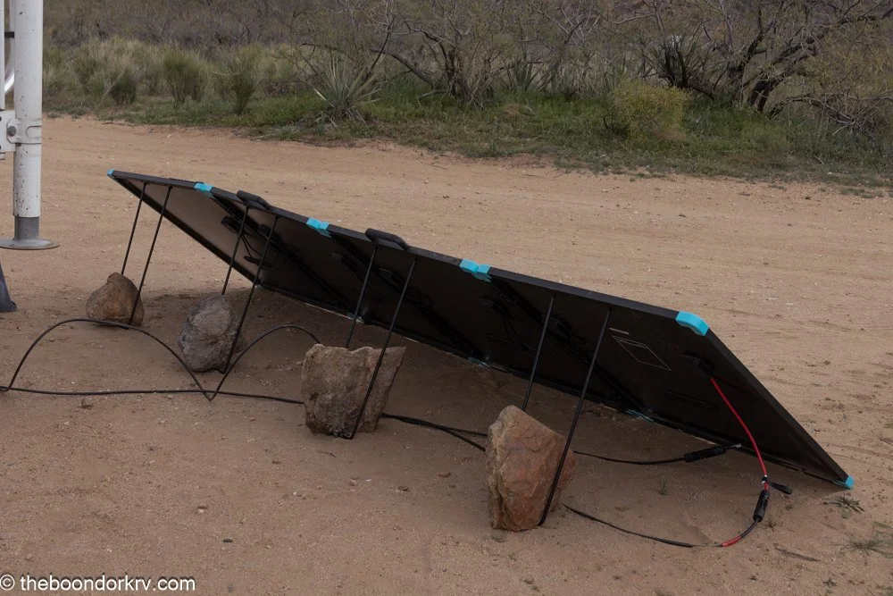 Here you can see the large rocks holding the solar panels down when it got windy. The rocks held the panels down just fine, but I need an easier, less labor-intensive way to do it.