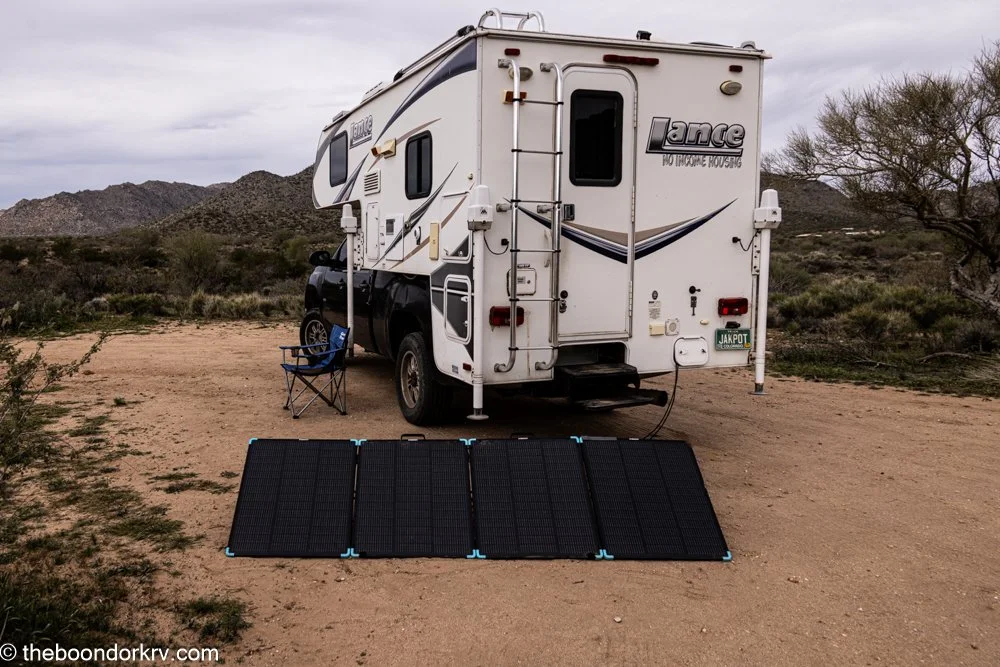 Here’s a picture of the front of the solar panels. As you can see, the wires go into a little hatch on the back of the camper. That hatch covers up the gray and black water drain valves. When I unhook the wires at the solar panels, I fold them up and stick them in the little cubby.